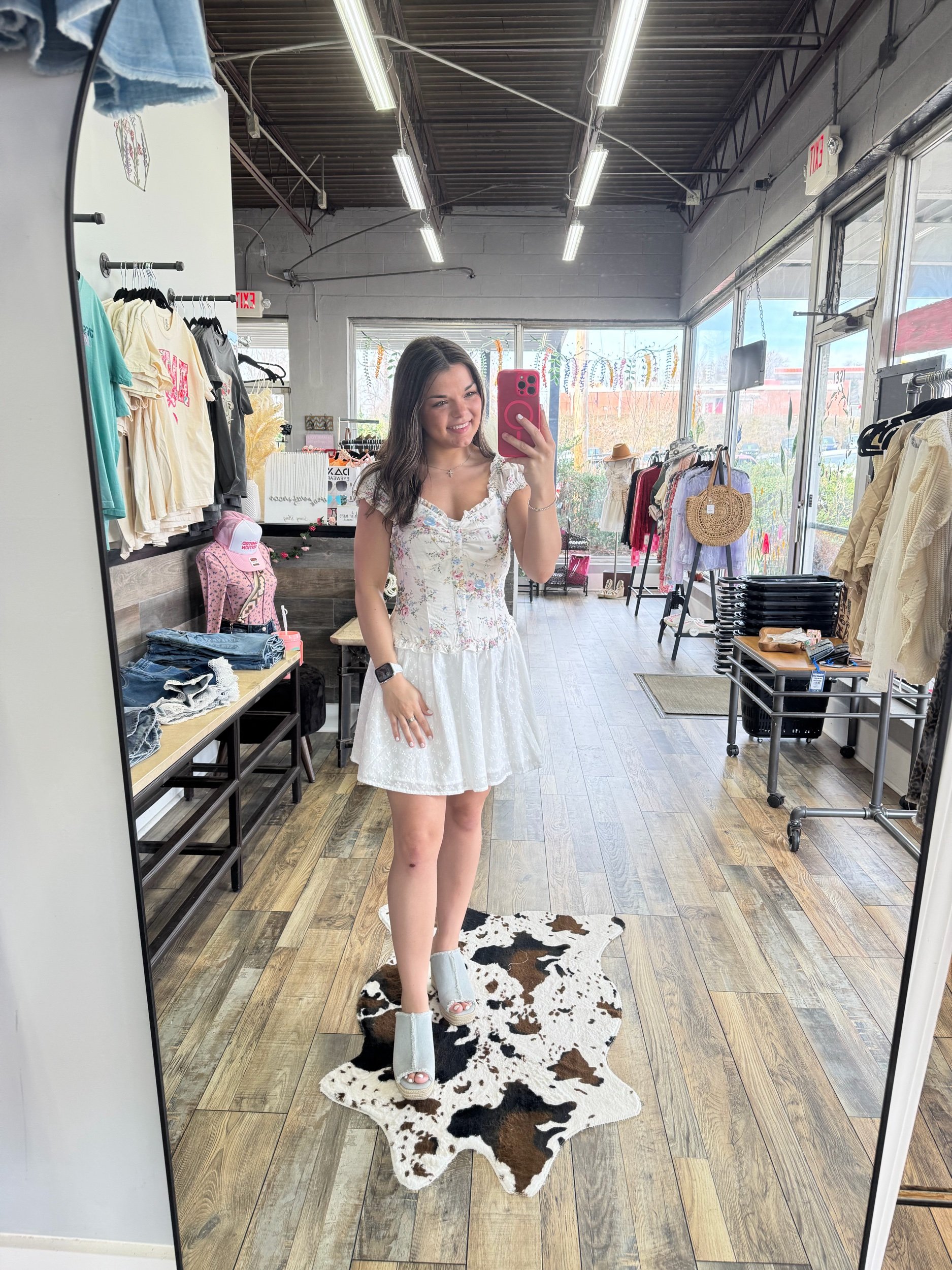 Store › Floral Ruffled White Dress Image 1 of 1 Floral Ruffled White Dress $49.99 Size: XS Small Medium Large Add To Cart Added!
